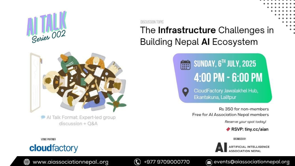 We're thrilled to announce AI Talk Series 002 focused on The Infrastructure Challenges in Building Nepal AI Ecosystem. Join us for an insightful discussion on the Infrastructure Challenges in Building Nepal AI Ecosystem in AI development. This session will explore Nepal stands at a critical juncture in the global AI revolution, yet faces unique infrastructure challenges that shape its technological landscape. Despite a growing community of talented developers and entrepreneurs, the country grapples with fundamental barriers including inconsistent power supply, limited high-speed internet connectivity, and insufficient computing resources needed for AI development and deployment with special focus on the Nepali context.