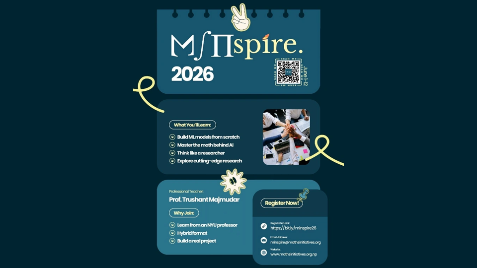 MINspire 2026 is a two-week bootcamp designed to take you from the mathematical foundations of machine learning to frontier research-level architectures used in modern AI systems. Organized by Mathematics Initiatives in Nepal, this program emphasizes learning by doing, where every concept is implemented in code the same day.