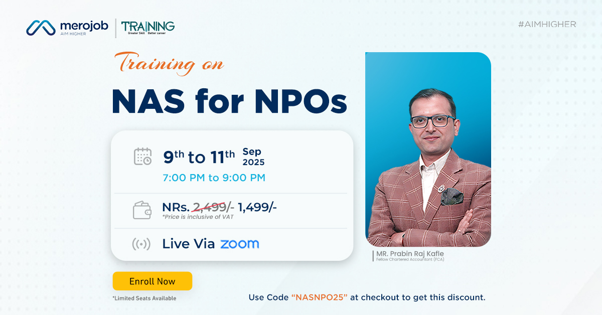 Merojob is organizing an online Zoom training on "NAS for NPOs" to simplify financial reporting and NAS implementation for NPOs. This course offers practical insights for Accountants, Finance Officers/Managers, Auditors, and aspiring professionals. Strengthen your expertise, prepare accurate financial statements, and advance your career in the evolving accounting field.